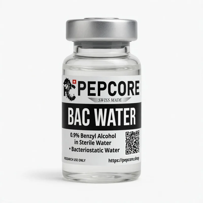 Bakteriostatska voda (BAC Water) je sterilna voda za injekciju sa dodatkom 0.9% benzil alkohola koji deluje kao konzervans. Koristi se za rekonstituciju liofilizovanih peptida pre upotrebe u istraživačkim protokolima. Benzil alkohol sprečava rast bakterija i omogućava višestruko uzorkovanje iz iste bočice uz zadržavanje sterilnosti tokom približno 28 dana nakon otvaranja, pod uslovom pravilnog čuvanja u frižideru. Ne sadrži rastvarače, boje niti aromate — samo WFI (Water for Injection) i benzil alkohol. Isključivo za laboratorijsku rekonstituciju u istraživačkim uslovima.